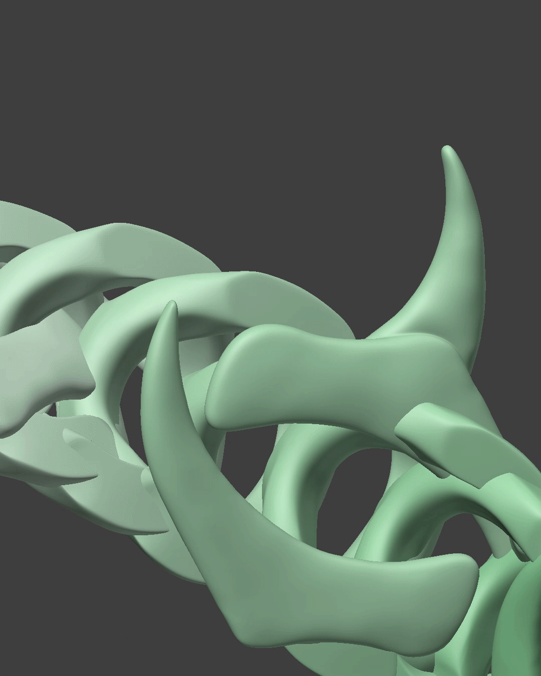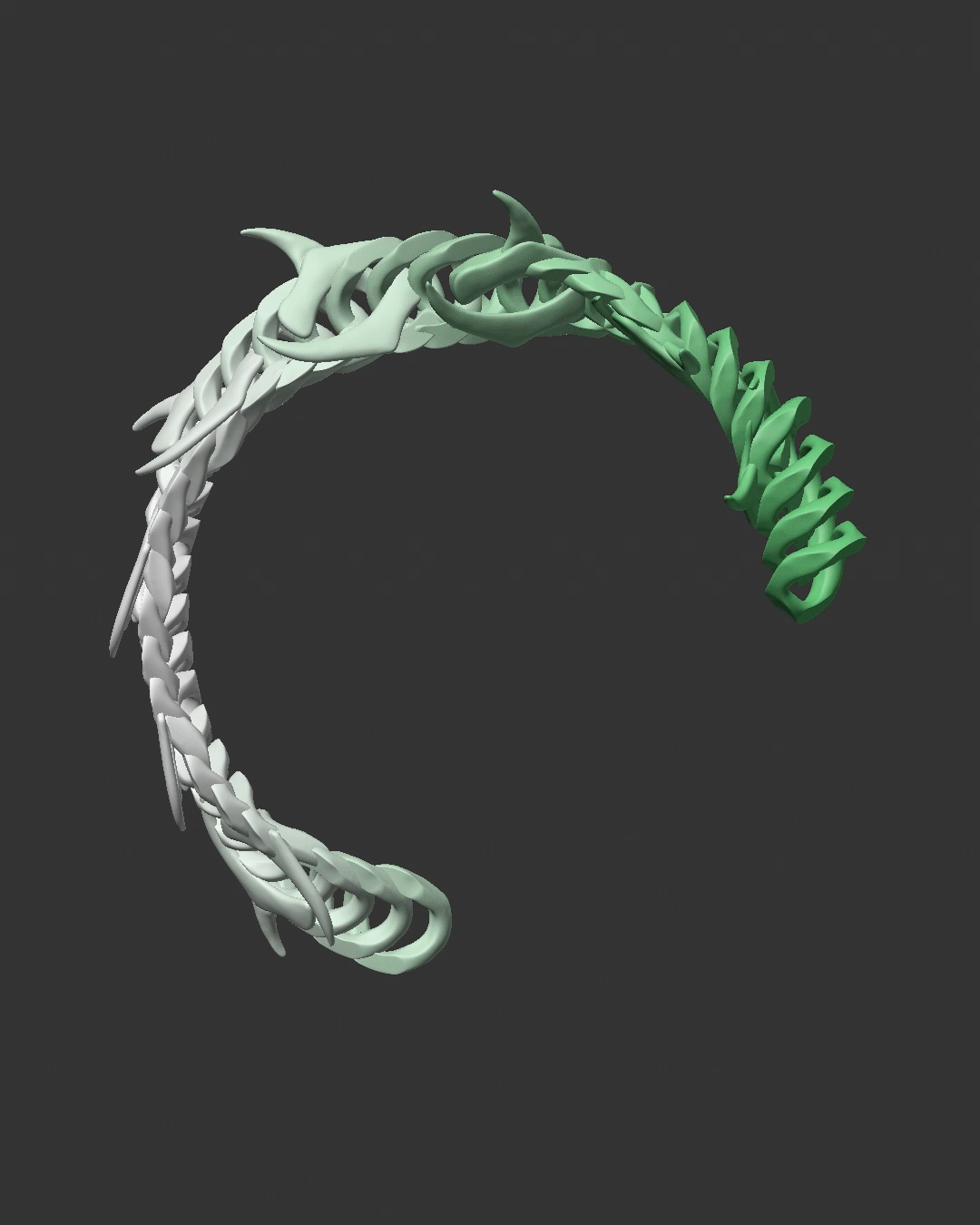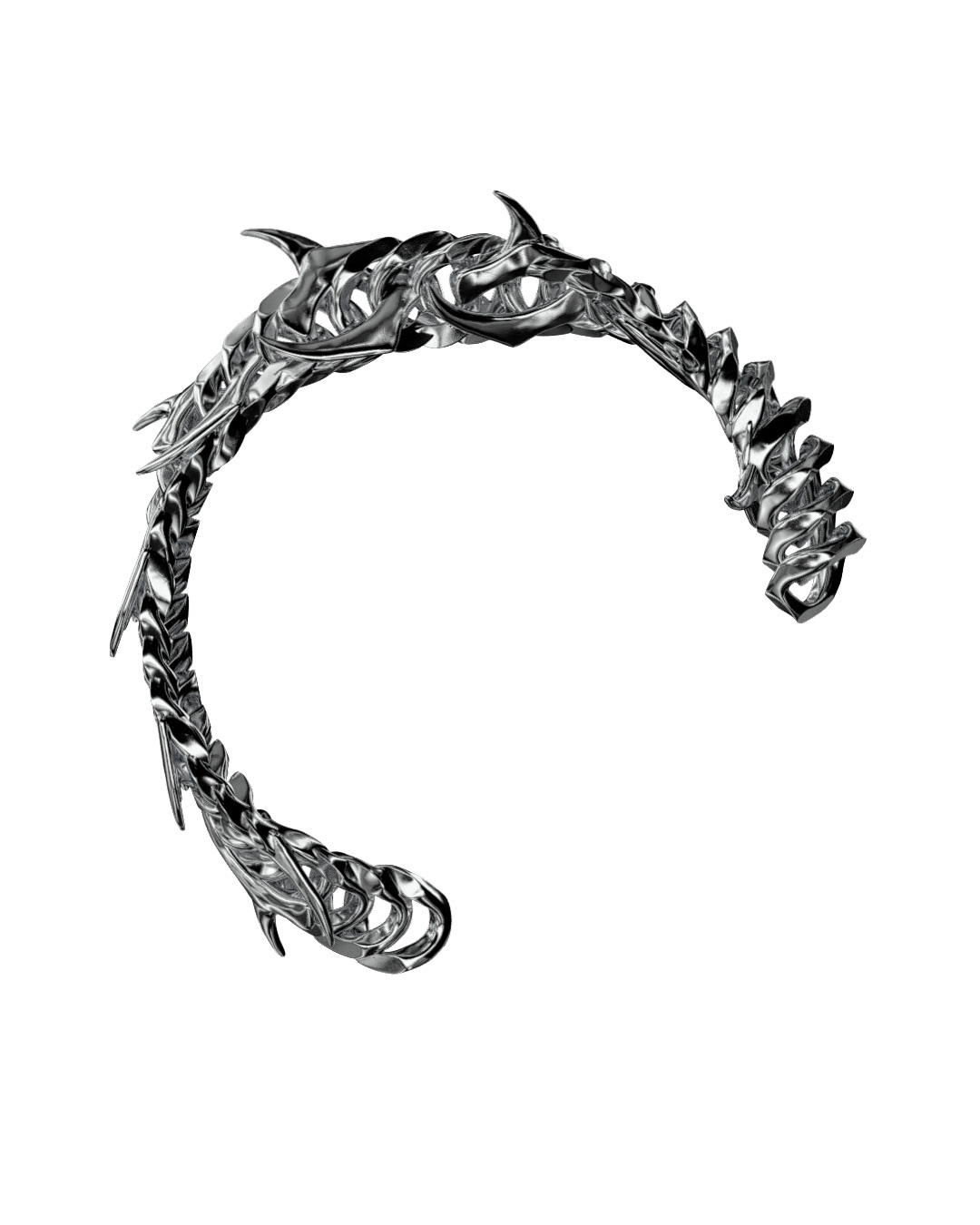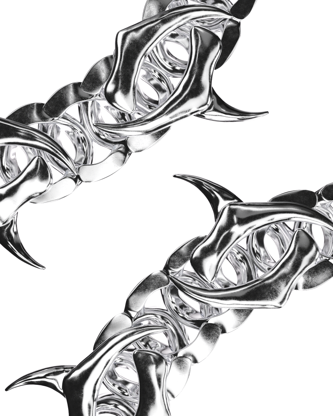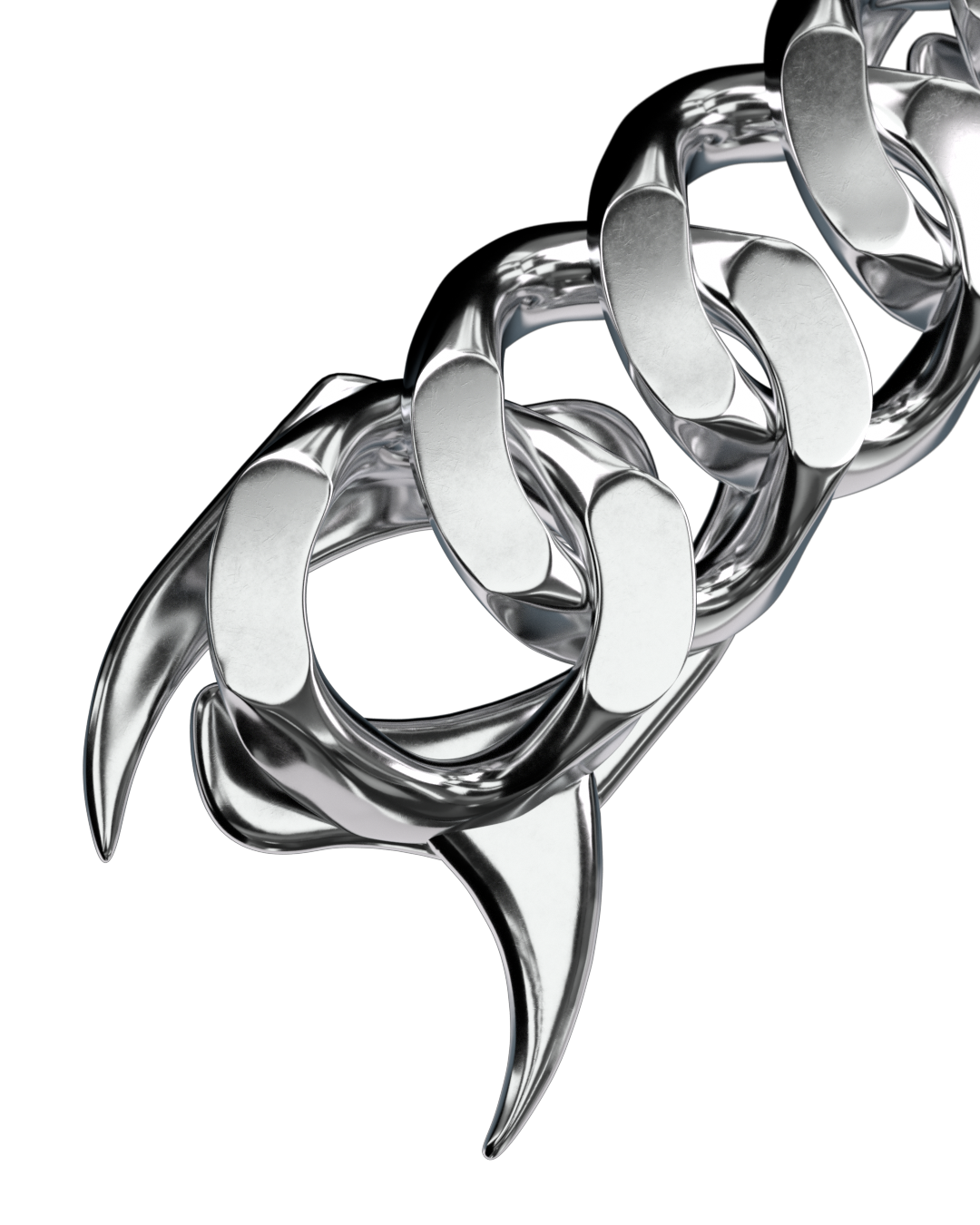 The chain’s distinctive shape with its sharp spikes and pronounced beveled edges plays a key role in how light travels across the surface, creating strong highlights and deep contrast that reinforce the piece’s graphic and industrial character.